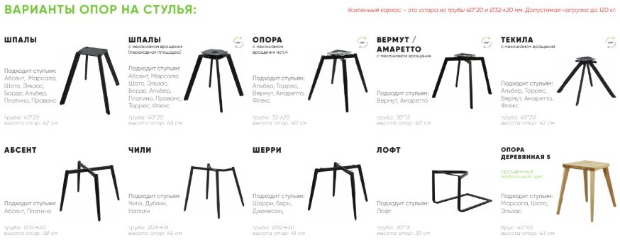 Стул может комплектоваться опорами шпалы-3 с мех. вращения или опорами Джоли/Джетта/Лиотта. Возможные варианты обивки мягкого элемента указаны в таблице применяемости. Ш64 Г48 В85