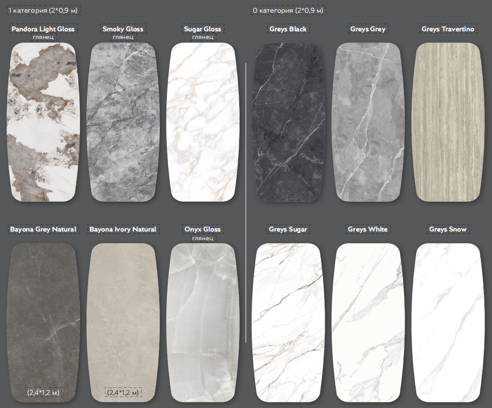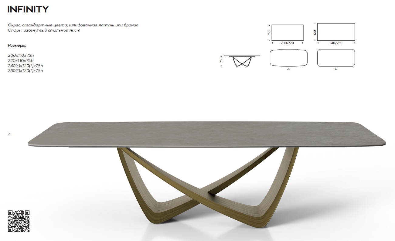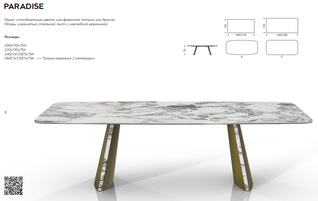 Окрас: стандартные цвета, шлифованная латунь или бронза Опоры: изогнутый стальной лист с накладной керамикой Размеры: 200х110х75h 220х110х75h 240(*)х120(*)х75h 260(*)х120(*)х75h Представленные образцы фотографий керамики могут незначительно отличаться от керамики в реальной жизни. Каждый из представленных вариантов керамогранита имеет до пяти вариантов лиц направления, а также расположения текстуры и рисунка.
